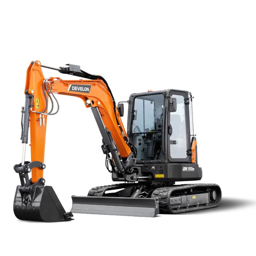 Miniescavadeira de esteira de aço de 380mm, modelo DX55-5C, equipada com motor a diesel YANMAR de 04 (quatro) cilindros em linha, potência de 48,5HPa, lança de 3,0m, braço de 1,60m, alavanca de operação do hidráulico através de Joystick, profundidade máxima de escavação de 3,645m, caçamba padrão com capacidade de carga de 0,18m³ com dentes, força de escavação na caçamba de 3,9ton, cabine fechada com ar condicionado, painel tipo touch screen.