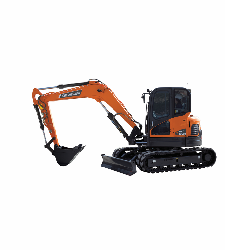 Miniescavadeira de esteira de aço de 450mm, modelo DX80R, equipada com motor a diesel YANMAR de 04 (quatro) cilindros em linha, potência de 53,5HP, lança de 3,38m, braço de 1,70m, linha hidráulica de rompedor, alavanca de operação do hidráulico através de Joystick, profundidade máxima de escavação de 4,18m, caçamba padrão com capacidade de carga de 0,28m³ com dentes, força de escavação na caçamba de 5,6ton, cabine fechada TOPS com ar condicionado, painel tipo touch screen.