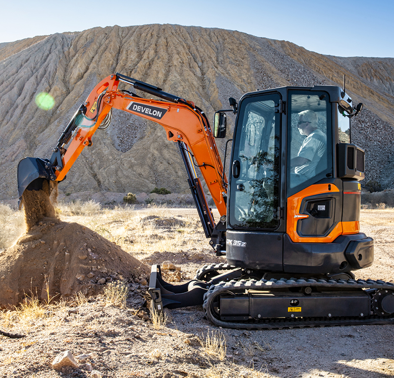 Miniescavadeira de esteira de aço de 450mm, modelo DX80R, equipada com motor a diesel YANMAR de 04 (quatro) cilindros em linha, potência de 53,5HP, lança de 3,38m, braço de 1,70m, linha hidráulica de rompedor, alavanca de operação do hidráulico através de Joystick, profundidade máxima de escavação de 4,18m, caçamba padrão com capacidade de carga de 0,28m³ com dentes, força de escavação na caçamba de 5,6ton, cabine fechada TOPS com ar condicionado, painel tipo touch screen.